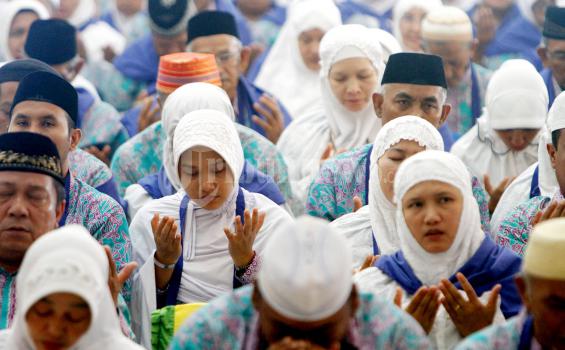 Para Jamaah Calon Haji (JCH) kloter pertama berdoa saat pelepasan di Asrama Haji, Banda Aceh, Minggu (2/10). JCH kloter pertama ini diberangkatkan menggunkan pesawat Garuda Air Bus A300 di Bandara Internasional Sultan Iskandar Muda, Blangbintang, Aceh Besar.