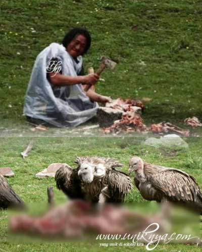 Dataran tinggi Tibet dengan Iklim keras, tanah dan bebatuannya, membuat pemakaman di sana terasa menjadi berat mungkin. Jadi, warga Buddha di Tibet sering melakukan apa yang mereka sebut ‘pemakaman langit’ di mana tubuh akan cincang, dicampur dengan tepung dan diatur sedemikian rupa agar dimakan oleh burung-burung pemakan bangkai. Mereka percaya bahwa tubuh hanyalah sebuah kapal untuk jiwa dan harus kembali ke alam.
