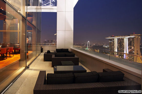 Dengan ketinggian 156 meter, Level 33 berada di puncak pusat perekonomian Marina Bay dengan pemandangan tak terkalahkan yang membawa mata kepada seluruh sudut kawasan itu. Tempat terbaik untuk menikmati pemandangan di restoran rersebut berada di teras luar. Namun Anda jangan sampai melewatkan sajian menu yang dihidangkan di atas meja kayu berbalut kulit dengan penempatan mesin pembuat bir seberat delapan ton dari tembaga raksasa dan pemanas air. Anda harus memesan tempat terlebih dulu sebelum berkunjung ke sini.