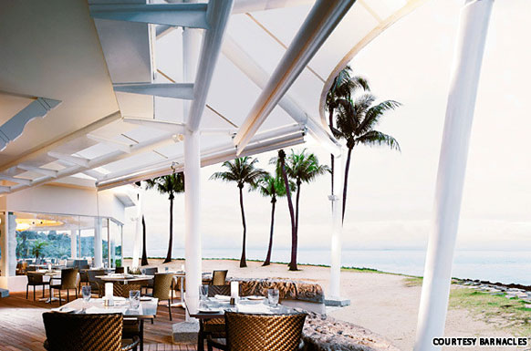 Jika mencari restoran yang menyajikan keindahan pemandangan air, tidak ada yang lebih baik dari Barnacles yang terletak di Shangri-La Rasa Sentosa. Restoran itu berada terpisah dari bangunan utama hotel namun bisa ditempuh dengan jalan kaki singkat. Mata Anda akan termanjakan dengan pemandangan ke lepas pantai Laut Cina Selatan. Tiap hari Minggu, meja-meja ditata di luar ruangan dan para tamu bisa menikmati brunch (sarapan sekaligus makan siang) di sana.